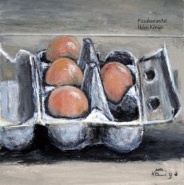 An diesem Bild habe am Wochenende gearbeitet. „In den Sechzigerjahren wurde die moderne Form des Eierkartons, inklusive Deckel mit praktischem Schnappverschluss, entwickelt. Diese revolutionäre Erfindung vereinfachte den Transport von Eiern erheblich und trug zu ihrem besseren Schutz bei. Zuvor wurden Eier lose verkauft und in Körben oder Papiertüten nach Hause getragen, wobei bis zu 30 Prozent der Eier zu Bruch gingen.“ (Bei mir wäre die Prozentzahl bestimmt noch höher gewesen) ;Zitat/Quelle EMFA . Das war doch einmal eine sinnvolle Erfindung, zudem aus Recyclingmaterial, dass man auch öfter verwenden kann.